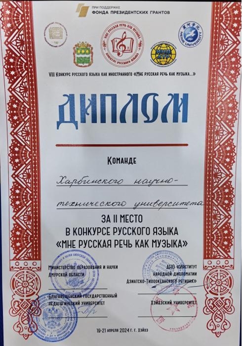 4月19日—21日,由中国黑河学院与俄罗斯布拉戈维申斯克国立师范大学、俄罗斯亚太人民外交研究所主办,黑河学院承办的第八届《俄语——我心中的歌》中国东北地区与俄罗斯远东地区高校大学生俄语大赛在黑河落下帷幕。本次大赛共吸引了布拉戈维申斯克国立师范、阿穆尔国立大学、黑龙江大学、哈尔滨师范大学、哈尔滨理工大学、黑龙江外国语学院、黑河学院等中俄院校60余名选手参加。我校代表队经过团队展示、国情知识问答、戏剧表演系列比赛项目的激烈角逐,最终斩获团体第二名。