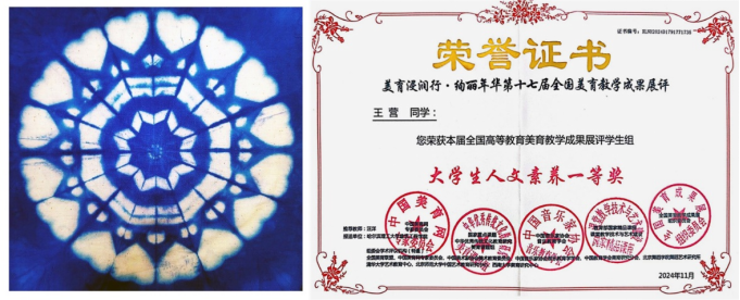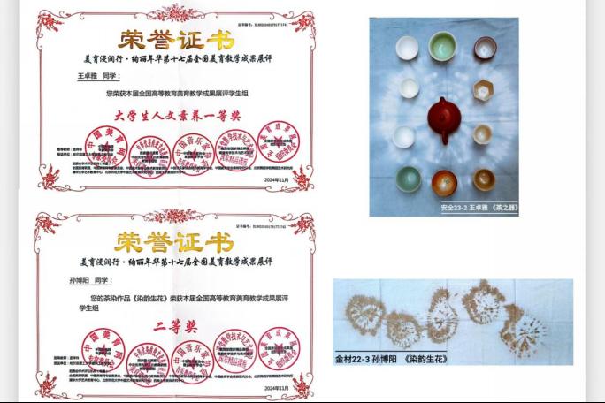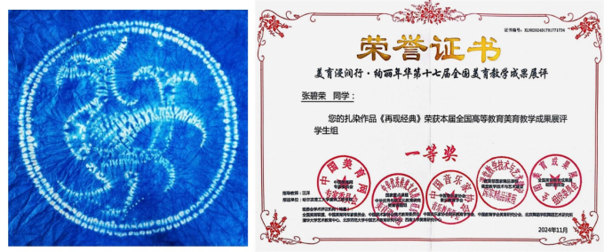 在这些课程中,我校学生们不仅学会了传统技艺的精髓,更在创作与实践中培养了独特的审美情趣与创新精神。他们用自己的双手,将传统文化与现代审美相结合,创造出了一系列令人瞩目的作品与成果。例如,在全国美育联盟、中国美育网专家委员会等多个权威单位主办的“美育浸润行·绚丽年华第十七届全国高校美育教学成果展”评选中,汪洋老师悉心指导材料与化工学院的王营同学创作扎染作品《爱的传承》,荣获大学生人文素养一等奖;经济管理学院的张碧荣同学的扎染作品《再现经典》则以其扎实的基本功与高难度的扎花技艺赢得了评委们的高度认可与赞誉,荣获了大学生作品一等奖;孟祥玲老师指导的茶席设计作品《茶之器》荣获大学生人文素养一等奖;插染作品《染韵生花》荣获了大学生作品二等奖,这些荣誉不仅是对学生们努力的肯定,更是对我校美育课堂教育成果的认可。