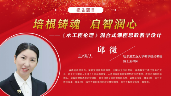 第二讲由国家级课程思政教学名师、宝钢优秀教师奖获得者、全国水业杰出青年、省委教育工委优秀共产党员、省委宣讲团成员,哈尔滨工业大学教学拔尖教授邱微教授作《培根铸魂启智润心——〈水工程伦理〉混合式课程思政教学设计》主题授课。邱微教授基于课程团队“大师+团队”的建设模式,深入挖掘思政元素,有机融入哈工大的红色基因,以学生为中心,以案例为主线,以思政为灵魂,结合具体教学内容,讲解课程思政与专业课程的有机融合方法,充分发挥课程育人功能,强化课堂价值观的引领。