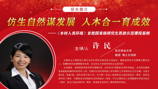 第三讲由全国林业工程领域工程专业学位研究生教育协作组组长、国家级思政示范课程主要完成人、智慧树网共享课程教学名师,东北林业大学许民教授作《仿生自然谋发展人木合一育成效——〈木材人类环境〉首批国家级研究生思政示范课程案例》主题授课。许民教授讲授了新时代背景下,林业工程学科课程如何更好与课程思政融合,并结合导学思政案例,分享了如何在课堂教学过程中丰富、完善并持续改进课程思政建设,形成特色鲜明,持续建设的课程思政体系。