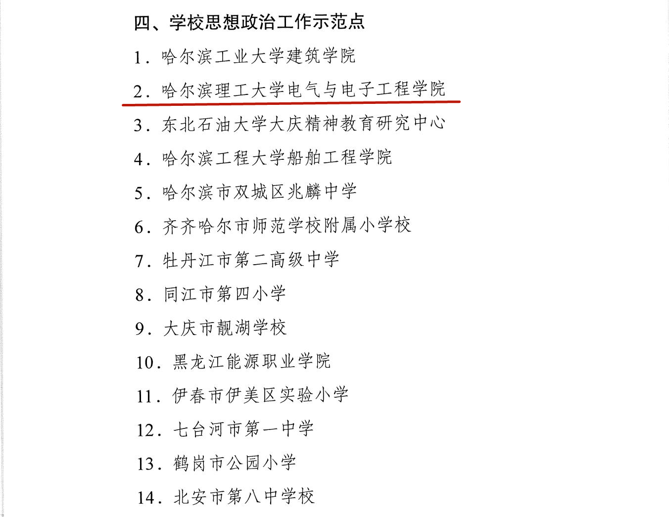 近日,省委宣传部发布《中共黑龙江省委宣传部关于命名第八批全省基层思想政治工作示范点的通知》,我校电气与电子工程学院被命名为全省基层思想政治工作示范点。