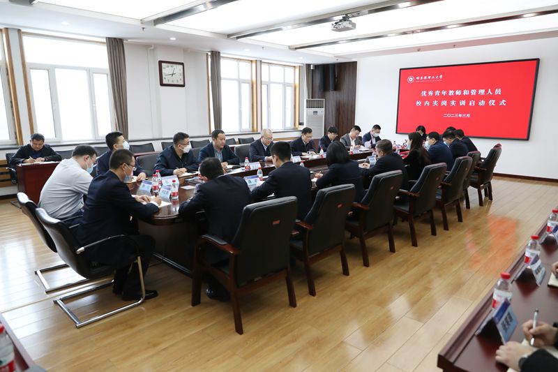 为深入贯彻“工作落实年”活动的相关要求,进一步加强我校干部梯队建设,强化青年教师和后备干部的培养,优化干部成长路径,增进教学单位与机关职能部处的双向沟通,培养选拔更多素质全面、能力突出、勇挑重担的专业化干部。3月15日中午,优秀青年教师和管理人员校内实岗实训启动仪式在教学主楼第二会议室召开。学校党委书记赵琳出席会议并讲话,各实岗实训人员及各培养导师参加会议。会议由学校党委副书记郭加利主持。
