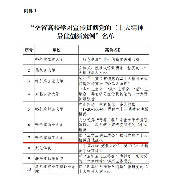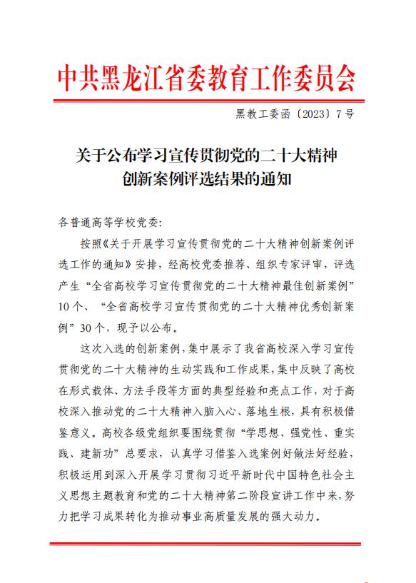 本次学习宣传贯彻党的二十大精神创新案例评选,是由省委教育工委组织开展,经高校党委推荐、组织专家评审,评选产生了“全省高校学习宣传贯彻党的二十大精神最佳创新案例”10个、“全省高校学习宣传贯彻党的二十大精神优秀创新案例”30个。自党的二十大召开以来,学校党委高度重视党的二十大精神学习宣传贯彻,着力推动“第一时间”跟进学、“示范带动”规范学、“融入课堂”深入学;着力开展高位推动覆盖讲、上下贯通融合讲、先优典型特色讲;着力与提能力、转作风相结合、与推行“马上就办”相结合、与“引育留用”一体推进的人才工作格局相结合,助力龙江全面振兴全方位振兴,展示了我校在深入推动党的二十大精神入脑入心、落地生根的生动实践、亮点工作和典型经验,为深入学习贯彻党的二十大精神提供了积极借鉴。