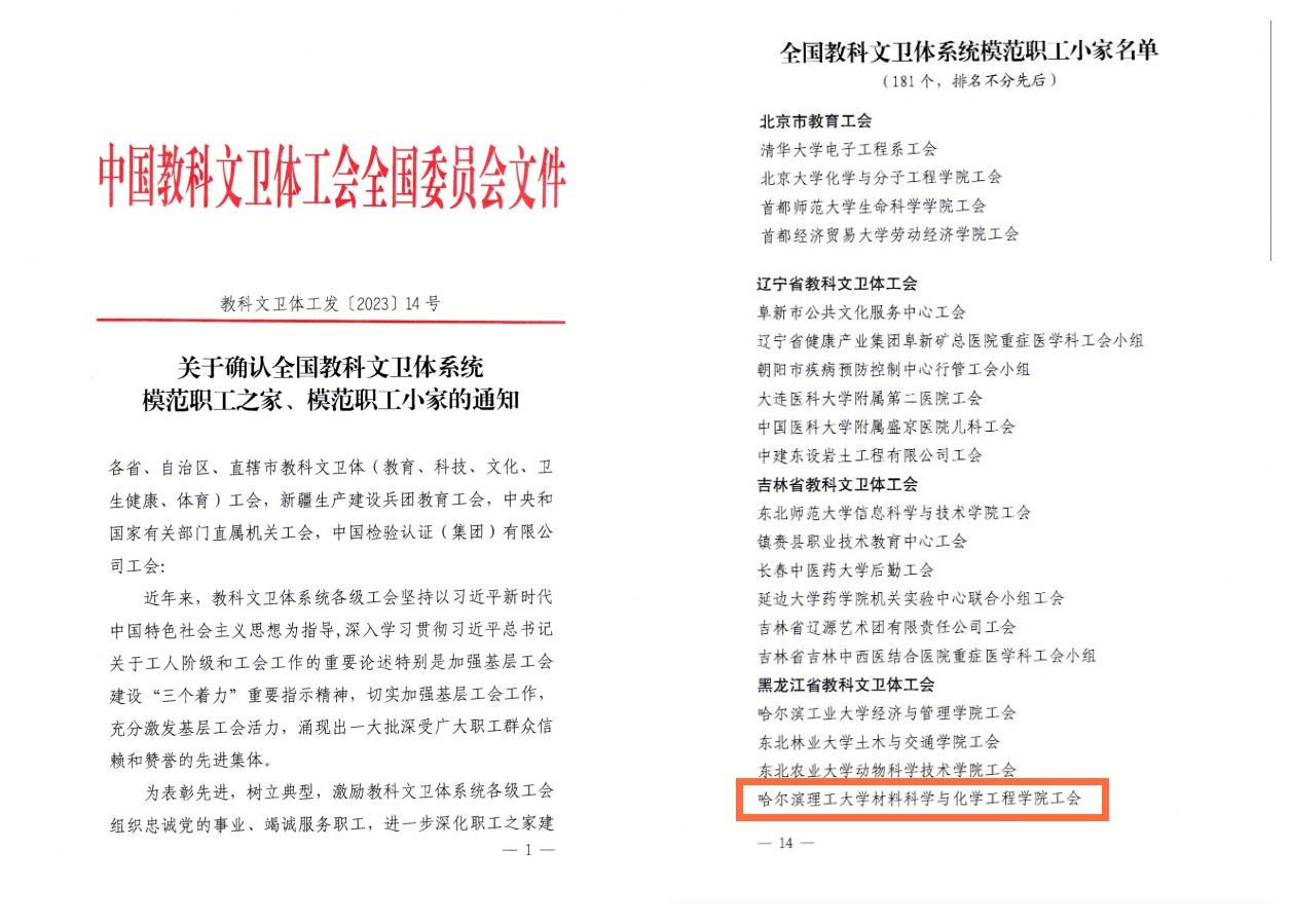为表彰先进,树立典型,激励教科文卫体系统各级工会组织忠诚党的事业、竭诚服务职工,进一步深化职工之家建设,团结引导广大职工群众听党话、跟党走,中国教科文卫体工会决定选树一批全国教科文卫体系统模范职工小家。8月28日,中国教科文卫体工会全国委员会下发文件,我校材料科学与化学工程学院工会被选树为“全国教科文卫体系统模范职工小家”。全国有181个单位(黑龙江省6个)被选树为全国教科文卫体系统模范职工小家。