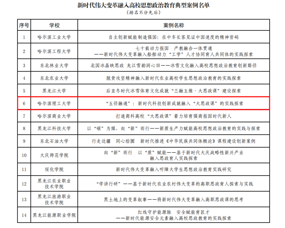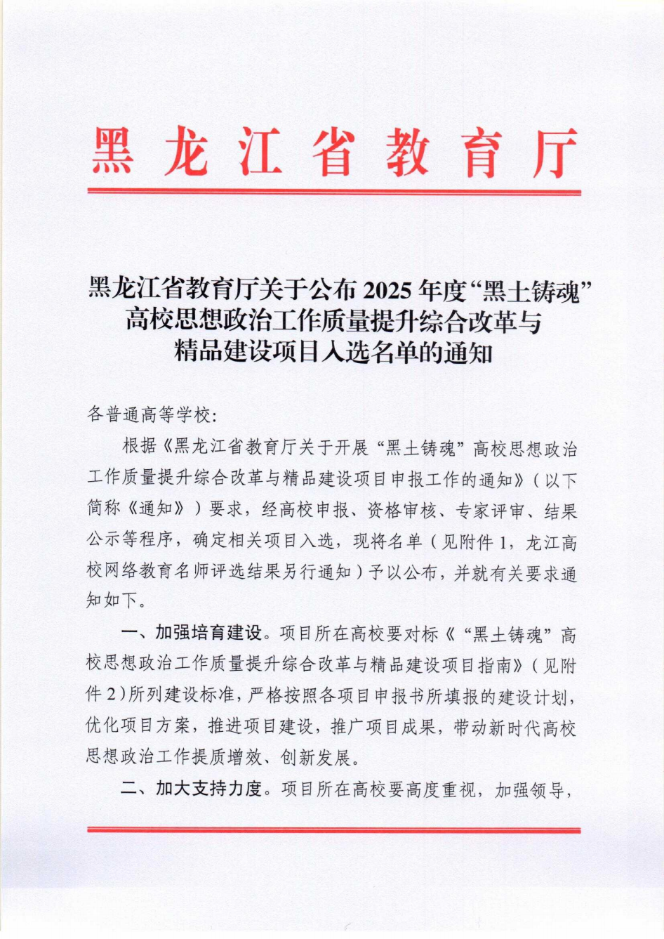 近日,黑龙江省教育厅公布2025年度“黑土铸魂”高校思想政治工作质量提升综合改革与精品建设项目入选名单,我校5个项目成功入选,入选项目数量居省内高校前列。
