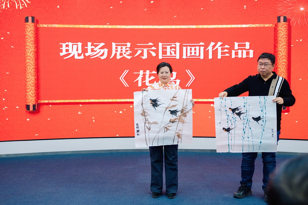 民盟哈理工委员会代表现场展示国画作品《花鸟》
