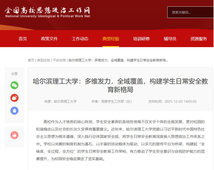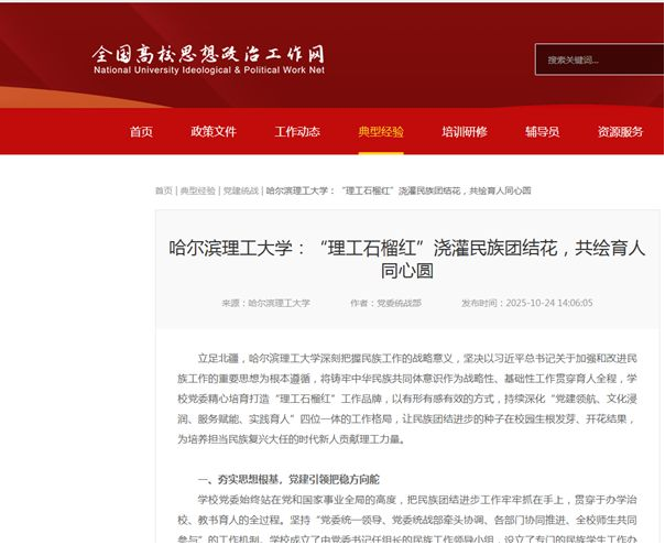 回顾2025年,学校党委以高度的政治自觉和强烈的使命担当,推动思想政治工作在体系构建、场域拓展、内涵深化、品牌塑造上取得系统性突破。展望未来,学校将始终胸怀“国之大者”,以新时代立德树人工程为总揽,对标教育强国建设要求,聚焦重点难点持续发力,奋力在“大思政课”综合改革上实现新突破,在数字思政赋能上构建新范式,在育人共同体建设上打造新样板,不断完善具有哈理工特色的高水平思想政治工作体系,为培养更多听党话、跟党走、有理想、敢担当、能吃苦、肯奋斗的时代新人,为实现中华民族伟大复兴的中国梦贡献更多更大的理工智慧和力量!