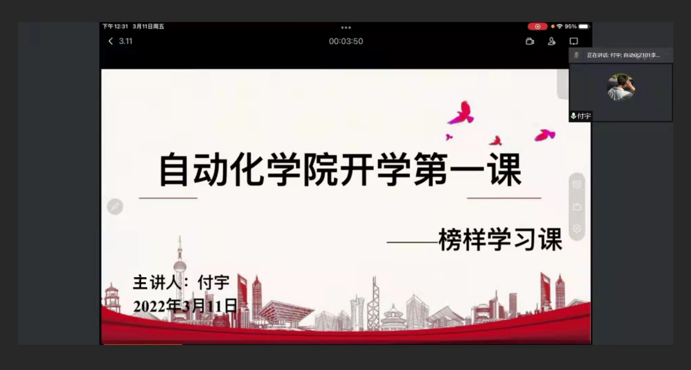 为深入贯彻落实我校第四次党代会精神,按照学校学工部“开学第一课”工作安排,聚焦学院学生的综合能力培养,切实提高学生的学习能力,自动化学院组织开展“开学第一课”之榜样学习课活动。本次活动于3月11日通过腾讯会议形式进行线上开课,自动化学院辅导员付宇负责本次授课。