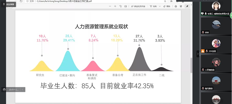 徐岩向毕业生家长通报了学院本科毕业生目前就业去向落实情况。经管学院 2022 届本硕博毕业生预计793人,毕业生规模创历史新高。截止3月末,学院本科毕业生预计就业率45.62%,比去年同期就业率低8.74%。他强调,受新冠疫情和经济下行压力叠加影响,就业形势特别复杂严峻,毕业生中慢就业、二战考研、尼特族等现象凸显。作为基层学院,直接面对毕业生、家长和用人单位,必须攻坚克难,制定切实可行的措施,促就业,保稳定,做好人才培养“最后一公里”。