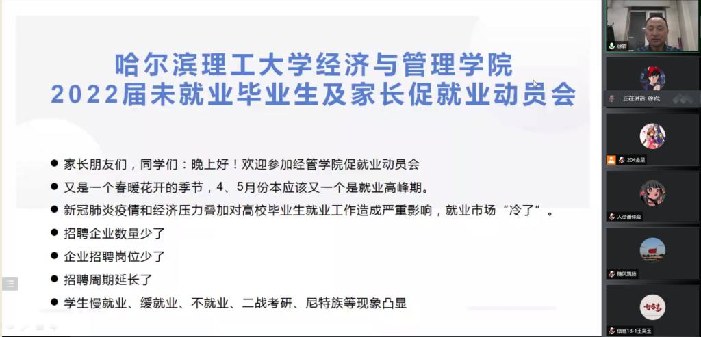 3月31日19时,经济与管理学院召开2022届未就业毕业生及家长促就业动员会。学院党委书记周长群、本科生毕业班辅导员、未就业毕业生及家长参加了本次会议。学院还特邀智联招聘校园招聘事业部渠道高级经理邢庆恒举办就业指导讲座。会议由学院党委副书记、学院毕业生就业工作领导小组副组长徐岩主持。