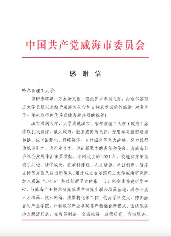 2022年1月,中共威海市委市政府给我校发来感谢信。