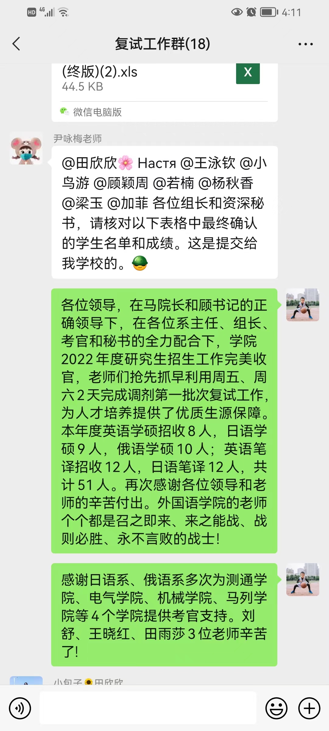 在学校研究生处、外国语学院党政正确领导下,在全体组长、考官、秘书及各组工作人员共同努力下,外国语学院2022年研究生招生复试工作圆满结束,高质量完成年度招生计划,为人才培养提供了优质生源保障。