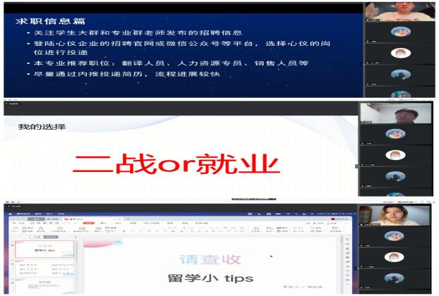 会议首先由辅导员王梓懿老师发言,就2022届毕业生目前的就业情况进行了简要介绍,指出学院对于毕业生就业工作高度重视。随后由优秀学生代表向同学们分享就业求职、考研升学方面的经验,分别针对简历制作、求职信息搜寻、考研留学注意事项给同学们提出了宝贵意见。整场会议气氛热烈,参会同学积极互动,相信通过此次会议,同学们能更好地认清目前的就业状况,合理安排时间,在完成学业任务的同时,把目光转移到就业准备上来。