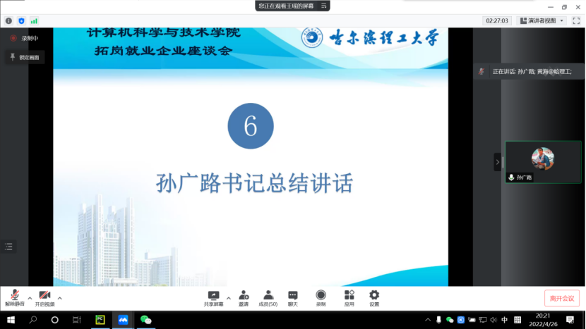 为贯彻落实《黑龙江省高校书记校长访企拓岗促就业专项行动的实施方案》文件精神及省教育厅相关会议工作要求,结合学校关于《哈尔滨理工大学校级领导班子成员访企拓岗促就业专项行动的实施方案》文件精神,为了推进学校与企业之间的交流合作,增进双方交流互信,畅通信息交流渠道,促进学校人才培养,提升学生就业竞争力,促进毕业生充分就业、高质量就业,千方百计开拓更多就业岗位和机会,4月26日晚18时,计算机科学与技术学院通过腾讯会议线上召开了拓岗就业企业座谈会,会议由学院院长黄海主持,学校纪委书记孙树海、学院班子成员、毕业班辅导员、各系主任和29家企业负责人参加了座谈。