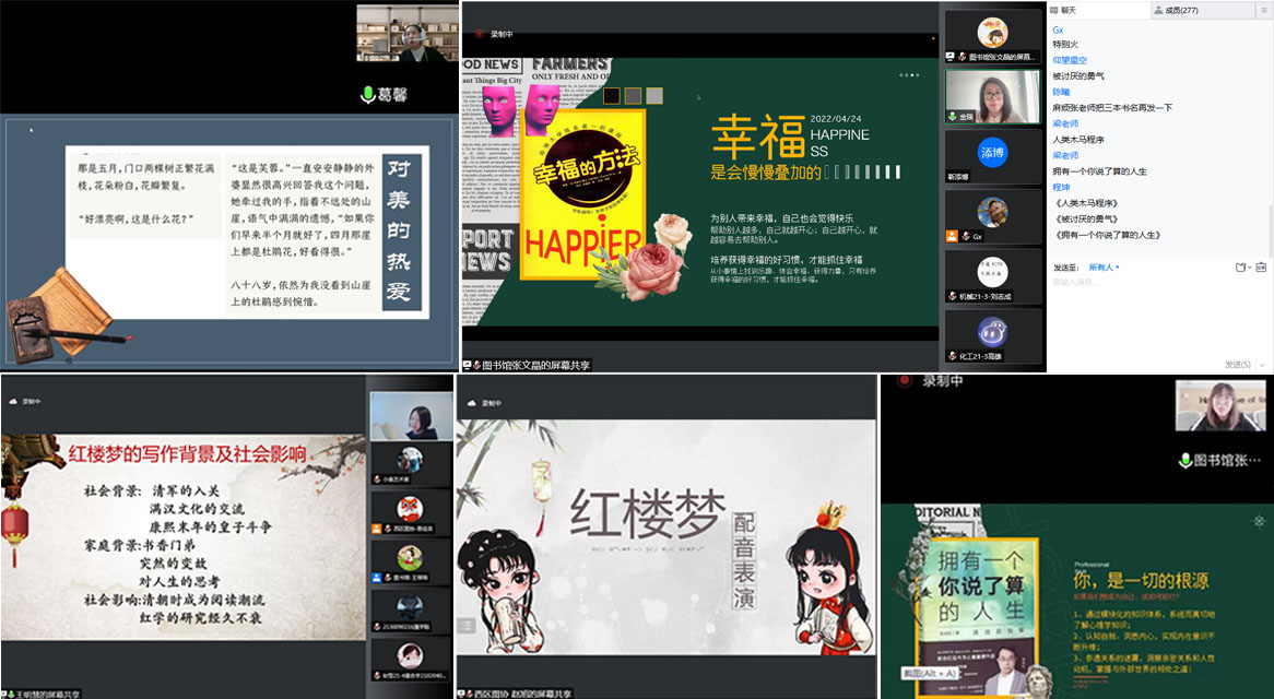 系列活动(二):举办的线上读书分享会,其中有我校外国语学院葛馨教授主讲的《秋园:微小的个人所呈现的鲜活历史》,黑龙江大学信息管理学院王明慧副教授主讲的《<红楼梦>——关于青春的挽歌》,我校图书馆馆员张文晶、金瑛主讲的《疫”路心防——积极心态调节书单分享》