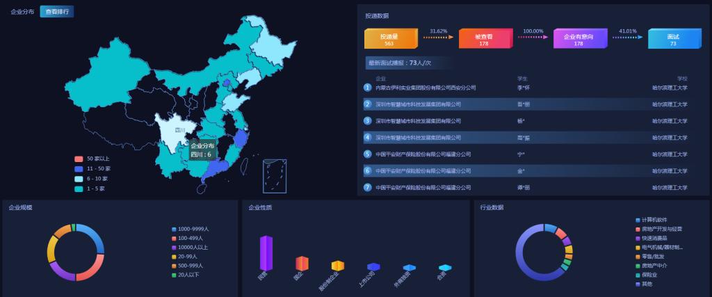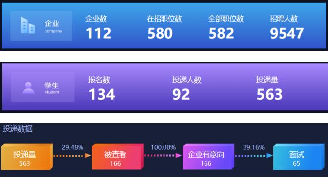 此次双选会共有112家企业参加,招职位数高达580个。134名毕业生参加双选会,其中有92人次进行了简历投递,累计投递了563份简历,其中166份简历被查看,占比为29.48%。被查看的简历都获得了企业的意向,其中有69人次进行了面试,占企业有意向简历数的40%。可见同学们参与积极性强、参与热情较高。