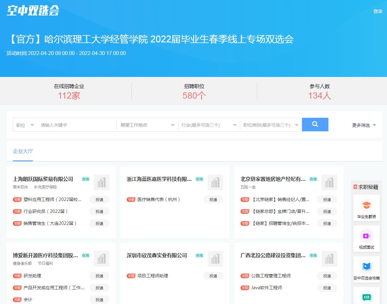 为切实做好2022届毕业生就业服务工作,推动毕业生与用人单位之间实现精准供需对接,搭建校企合作线上交流平台,经管学院与智联招聘合作,于2022年4月20日至4月30日举办哈尔滨理工大学经管学院2022届毕业生春季线上专场双选会。