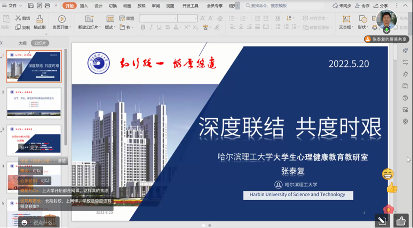 为了更好的促进家校联结,增强学生与家长、家庭与学校之间的有效沟通,将学校教育与家庭教育有机结合,形成教育合力,我校心理健康教育中心于5月20日19:00面向全体学生家长开展了“深度联结 共度时艰”主题心理健康教育讲座。讲座邀请国家二级心理咨询师、学校心理健康教师张泰复教授作为主讲嘉宾。讲座通过腾讯会议平台线上进行,共计300余名家长积极参与。