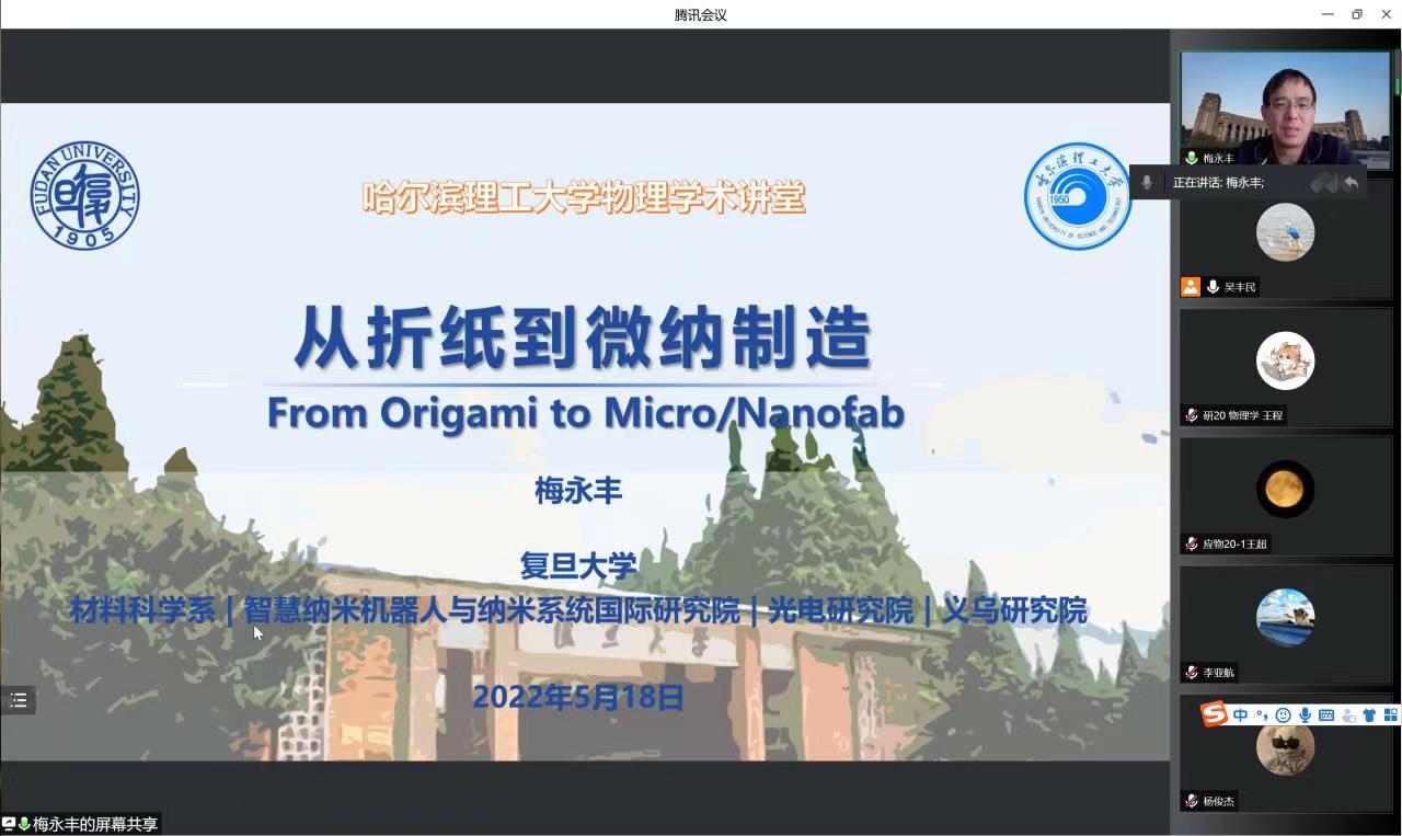 5月18日,复旦大学材料科学系博士生导师梅永丰教授受邀作线上学术报告,理学院物理学科教师、研究生以及哈尔滨工业大学等高校的百余名师生参加了此次会议。理学院应用物理系主任吴丰民教授主持报告会。