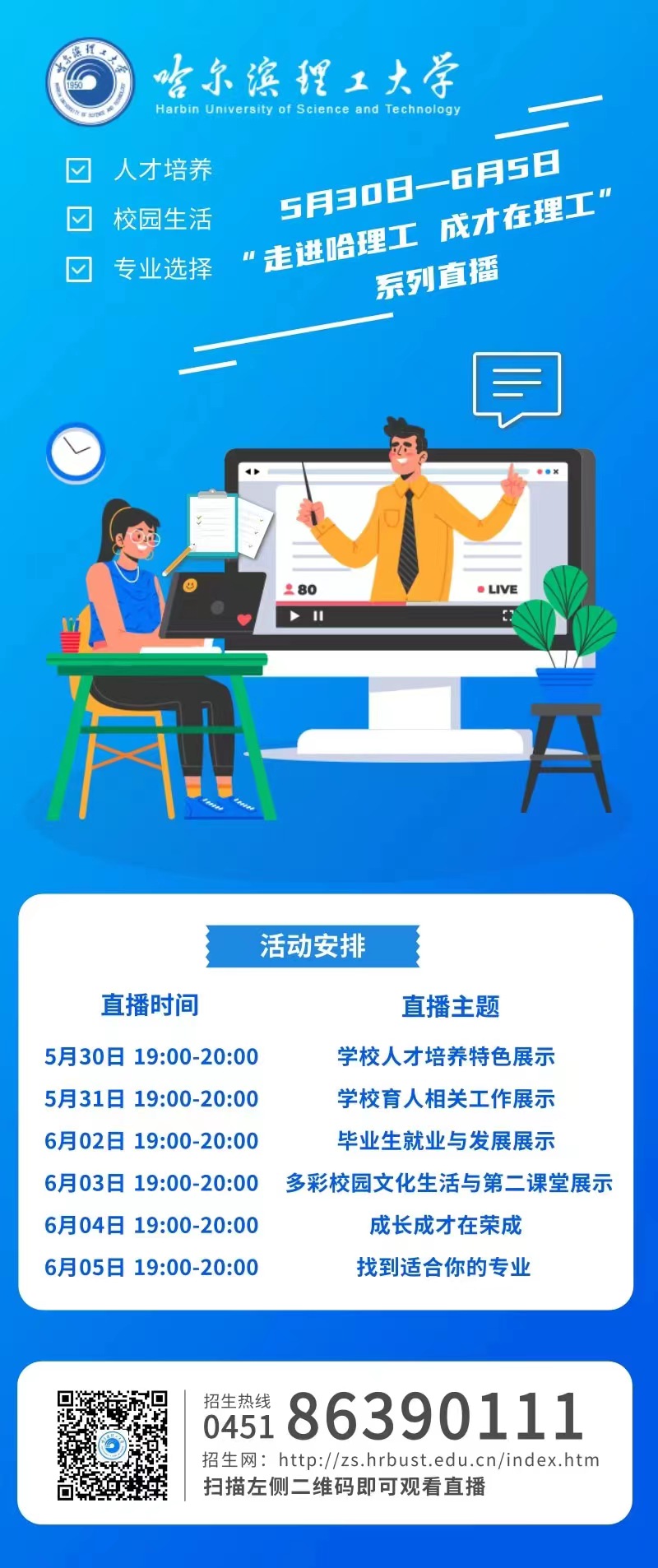直播将从我校人才培养特色展示、育人工作特色展示、就业与发展特色展示、校园生活与第二课堂特色展示、荣成校区人才培养特色展示等多个角度帮助广大考生和家长进一步了解哈尔滨理工大学“培养什么人”、“怎样培养人”。