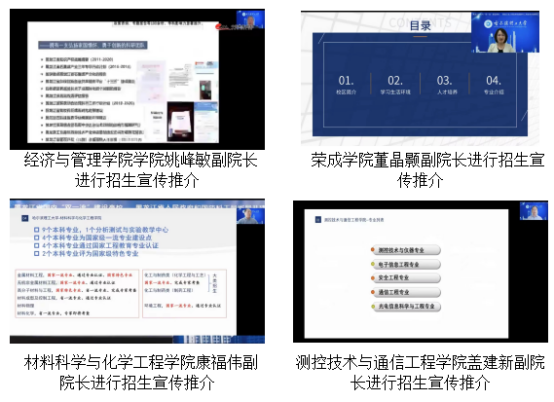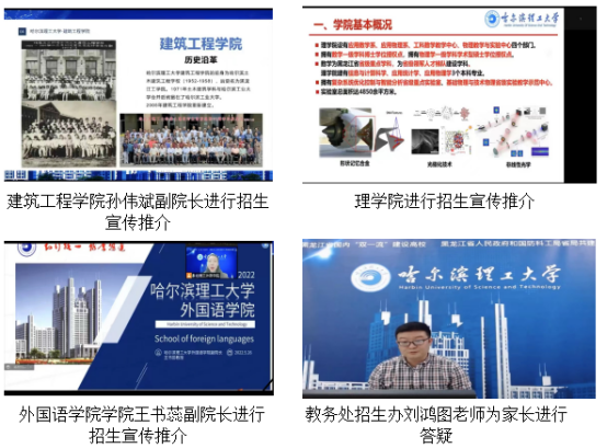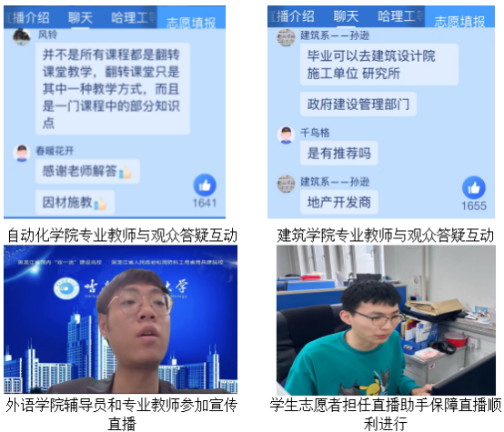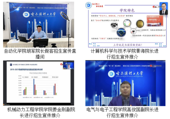 自动化学院录制了毕业生和创业校友访谈视频,从毕业生去向和校友发展角度吸引考生和家长;材料科学与化学工程学院制作了学院宣传视频,对学院进行充分展示;计算机科学与技术学院选派优秀毕业生在直播现场分享求学成长感悟;外国语学院辅导员王梓懿通过生动鲜活的现场交流展示学院人才成效和特点;学校本科招生办公室利用直播为考生和家长进行考前辅导,通过学校招生公众号留言为考生和家长邮寄《哈尔滨理工大学2019-2021高考数据》。此外,自动化学院、建筑学院、外语学院等学院专门安排了专业教师在直播间为考生答疑解惑。