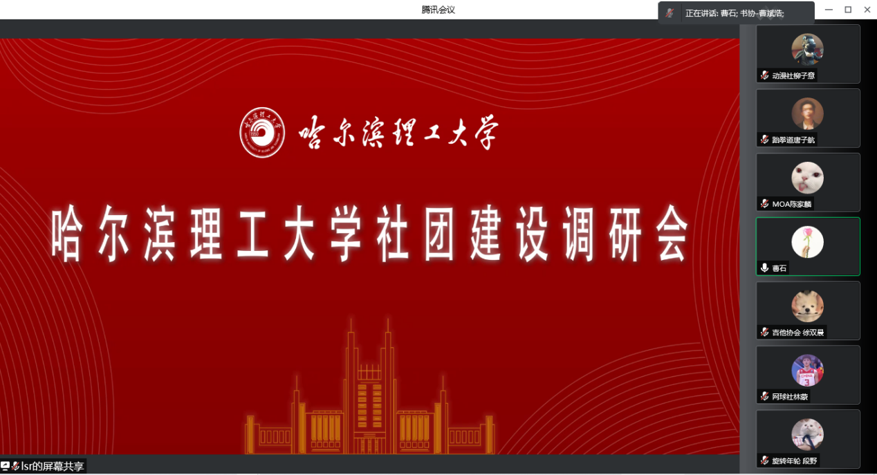 为全面推进我校学生社团品牌特色建设,充分发挥学生社团在校园文化中的积极作用,促使各类社团不断提高活动水平,进一步朝制度化、规范化方向发展,同时也为校团委进一步了解社团发展需求,鼓励扶持各社团、各特色队伍争创一流、打造品牌,提升学校影响力,2022年6月4日,校团委于线上召开我校社团建设调研会。校团委副书记曹石、校团委老师李晟睿、校团委实习老师梁禹淇及各学生社团负责人参加本次会议。