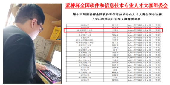 王开纪同学获得“C/C++程序设计大学A组”全国一等奖
