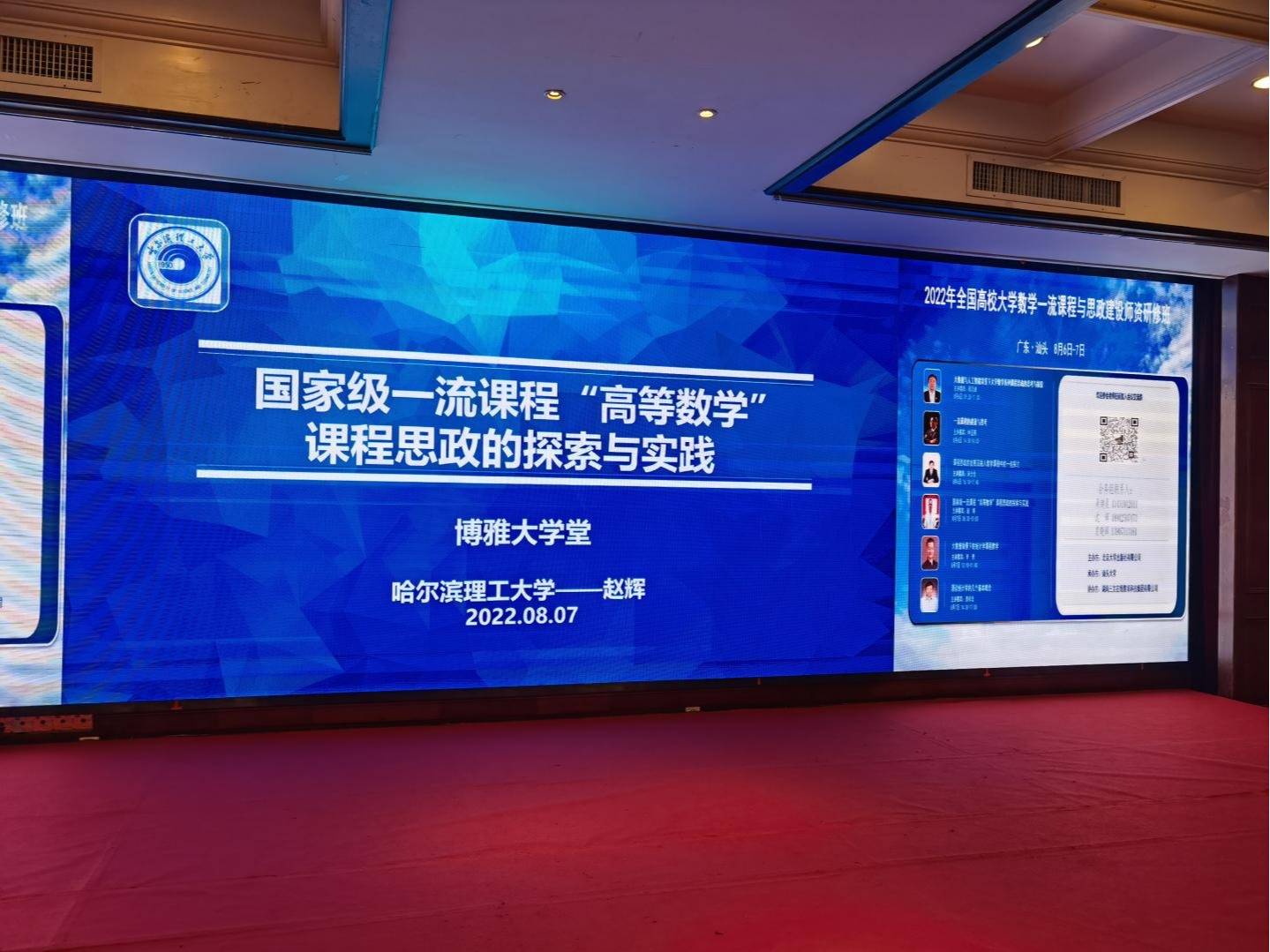 8月5日至8日,由北京大学出版社主办,汕头大学承办的“博雅大学堂--2022年全国高校大学数学一流课程与思政建设师资研修班"成功举行。来自全国百余所高校的160余名大学数学教师报名参加了本次研修班,我校赵辉教授作为主讲嘉宾为本次研修班作了主题报告。