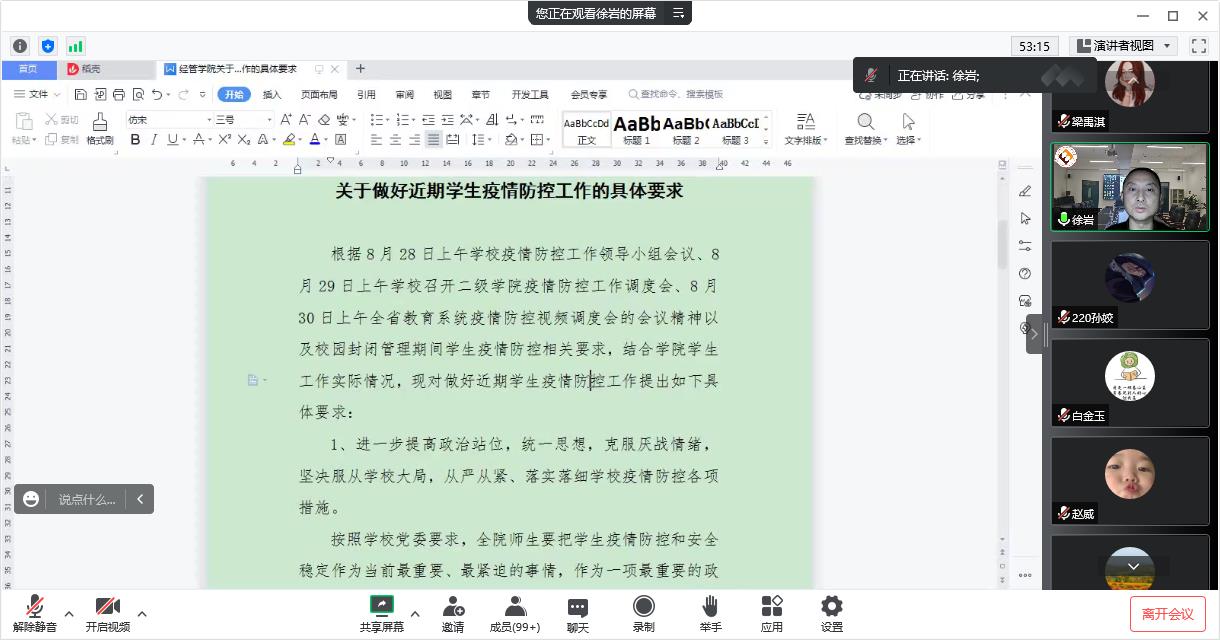 学院党委高度重视本学期学生返校工作,全体教师都将站在学生角度为同学们做好服务;徐岩副书记再次强调校园静态管理规定,对近期学生疫情防控工作进行了再动员、再部署。