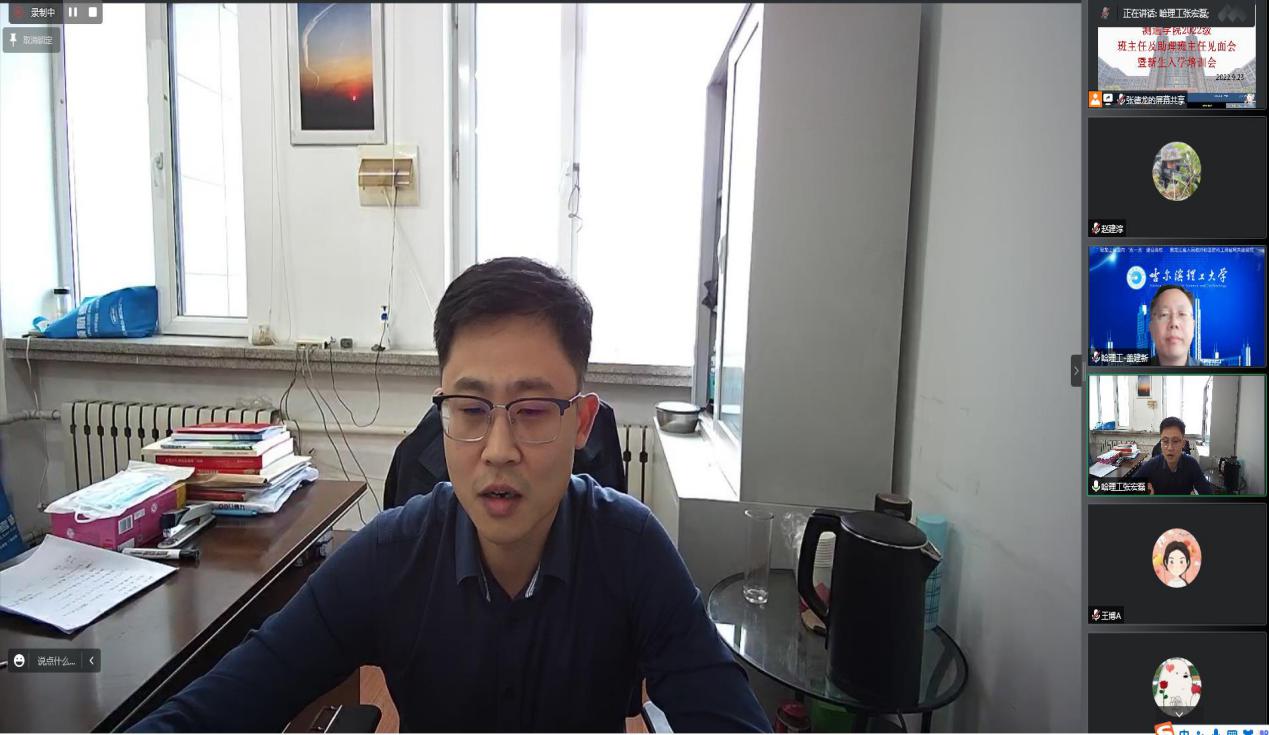 首先张宏磊介绍了2022级新生的自然状况,班主任和助理班主任的选聘情况,解读了《班主任管理办法》,进一步明确班主任工作任务和工作职责,并在立德树人、协同育人、学业指导、班级管理、疫情防控、重点人群关注、科技创新等方面提出了具有针对性、可行性、实效性的指导建议,希望班主任与辅导员一道“做好学生的引路人,当好培养者、倾听者和陪伴者。” 盖建新对新生班主任工作做动员讲话,分析班主任工作在学风建设和人才培养等方面的重大意义,并提出指导性建议。班主任工作是我校学风和德育工作不可或缺的力量,希望各位班主任老师要切实履行好班主任的职责,做学生成长路上的引路人,把立德树人作为学生工作最根本的任务,把思想教育融入到日常工作中,重点培养优良学风,侧重学业导航和成才指导。测控系主任陈寅生作为老班主任代表分享工作经验,班主任要多深入到班级和学生中,通过开展主题班会、学习经验交流会等形式加强学风和德育引领,同时要加强与辅导员的联系,共同关注学业成长的同时,关注学生的心理健康、疫情防控等安全方面的工作,形成合力有效引导,全方位助力学生成长成才。