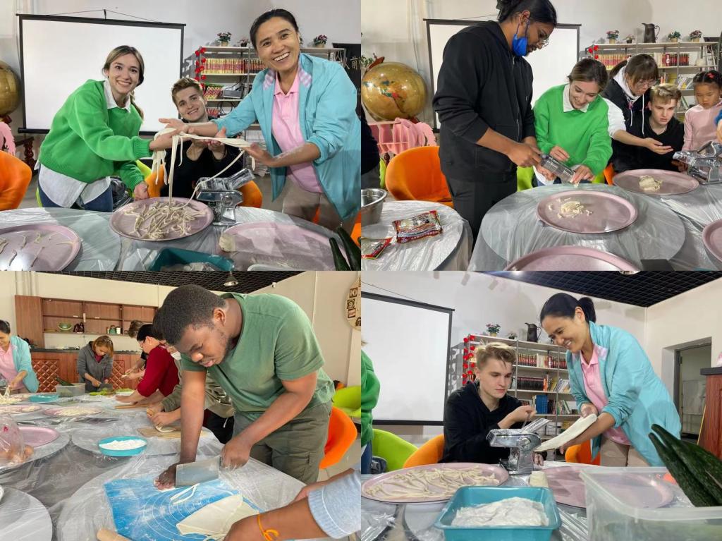 中午12点半,通过和面、揉面、搓面、擀面、切面……不一会儿,一碗碗热气腾腾、香喷喷的面条被端了上来,浇上留学生亲手制作具有东北特色的鸡蛋酱、拌上黄瓜丝。大家共同享用自己的劳动成果,纷纷称赞“国庆面好香”。俄罗斯籍留学生尼基塔:“这面太好吃了,我吃了五碗。”
