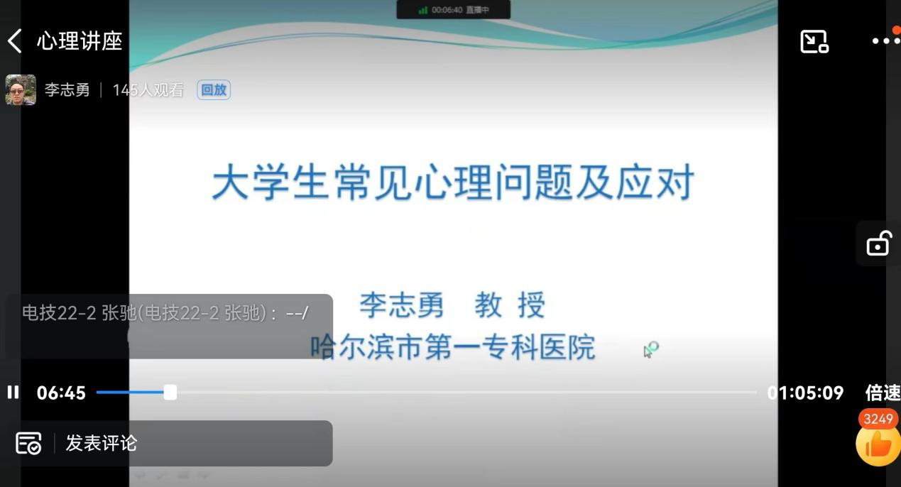 为积极响应以“营造良好环境,共助心理健康”为主题的2022年世界精神卫生日心理健康教育活动,推动学生提高认识,增强心理健康意识,关注心理精神需求,我校于10月14日举办了《大学生常见心理问题识别与应对》专题讲座。讲座特邀哈尔滨市第一专科医院四疗科主任李志勇教授主讲,2022级班级心理委员、近两年新入职辅导员近二百人聆听了讲座。