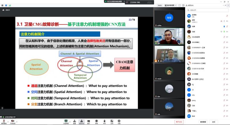 研讨会上,刘明教授围绕卫星发展特点与面临挑战展开主题报告。首先,针对卫星姿控系统有监督故障诊断的算法设计问题,基于卫星姿控系统故障诊断准确率低、时延高等情形,介绍了基于注意力机制增强的卷积神经网络,进而保证诊断准确率高以及浮点运算量低等优点。通过模拟7种故障工况,实现对故障的检测、报警和分类。其次,提出了改进的因果膨胀卷积方法解决了无监督航天器的异常检测问题,并通过半实物仿真实验验证了在该网络的训练下网络损失最终收敛的结论。然后,分析了现有故障诊断模型学习能力不足的缺陷,提出了一种基于切片残差注意力网络的新型故障诊断模型,通过对模型注意力进行合理分配,有效提升了故障诊断准确率。最后,展望了卫星自主智能健康管理和空间态势感知技术的发展趋势。