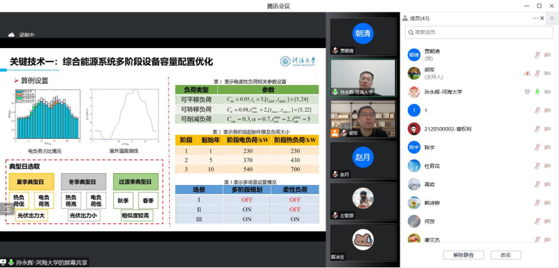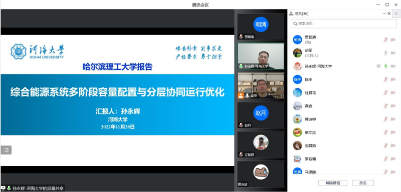 为进一步激发我院师生的科研热情,促进学术水平的不断提高,应自动化学院邀请并在科技处的大力支持下,11月28日,河海大学能源与电气学院教授、博士生导师孙永辉教授作了题为“综合能源系统多阶段容量配置与分层协同运行优化”的学术报告。本次报告为2022年度自动化学院“智能控制及其应用国际前沿学术研讨会”第12场学术报告,报告由自动化学院院长胡军教授主持,学院副院长李东洁教授、相关学院教师以及硕博研究生等50余人在线参会。