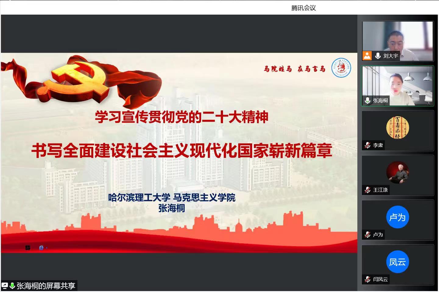 按照学校党委关于学习宣传贯彻党的二十大精神工作部署,12月10日下午,国有资产管理处邀请党的二十大精神学校宣讲团成员、马克思主义学院马克思主义基本原理教研室教师张海桐通过视频方式为全体人员作党的二十大精神专题宣讲。