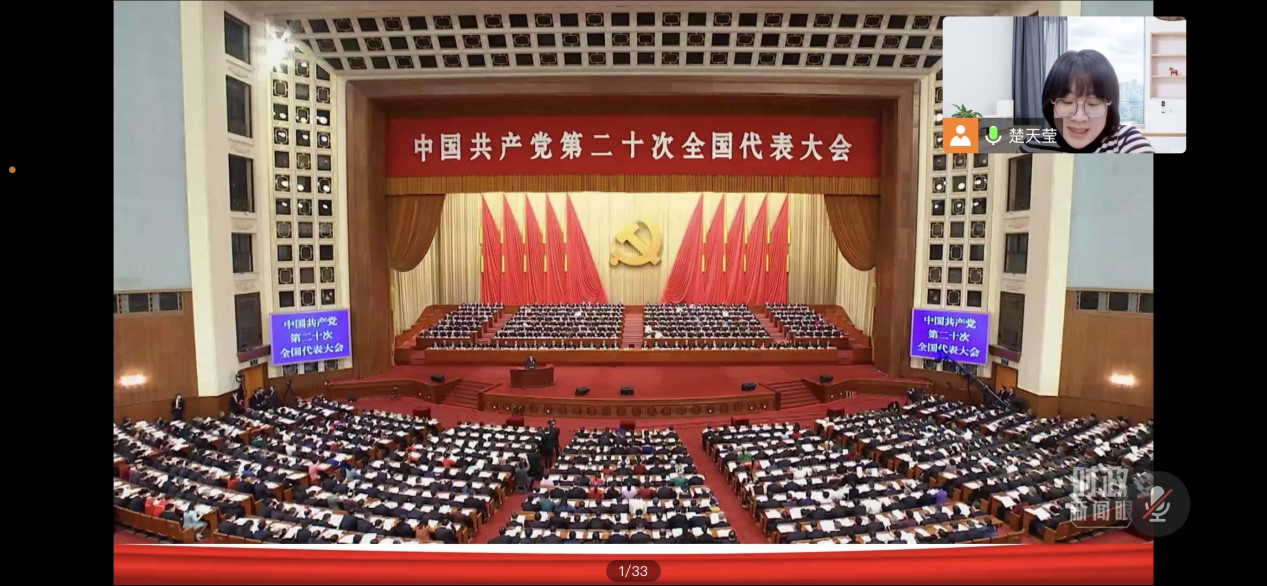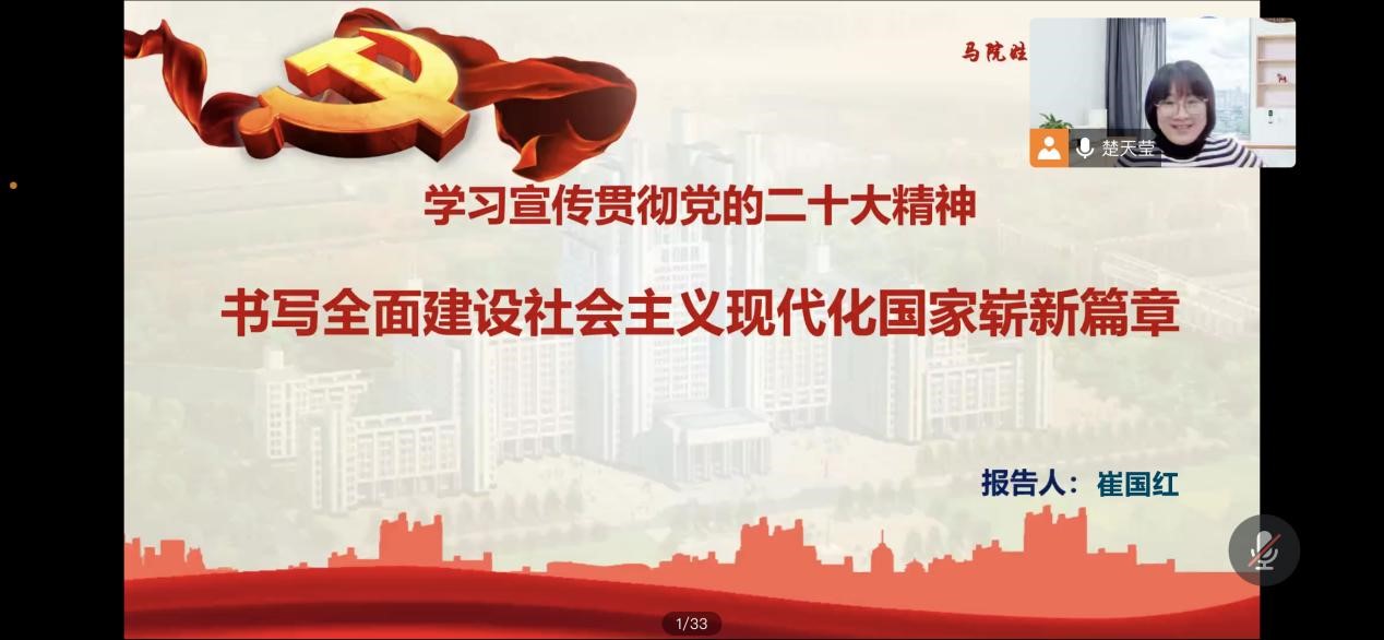 为深入学习宣传贯彻中国共产党的二十大精神,凝聚思想共识,提升学生党员理论素养,争当有理想、敢担当、能吃苦、肯奋斗的新时代好青年,机械学院于12月13日下午3时开展“谱写新时代中国特色社会主义更加绚丽的华章”学习党的二十大精神宣讲活动。宣讲人是学院二十大精神宣讲团成员崔国红老师,学生党员近300人线上聆听。