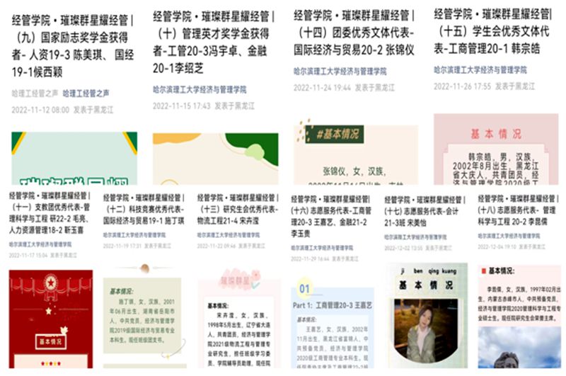经过学院推荐、个人事迹申报、宣传展示等环节,最终,从德智体美劳五个方面选取优秀学生典型,累计推出了18期优秀学生代表的事迹展示。他们脚踏实地、自强自立;他们勇于奉献、乐观向上。他们用平凡的方式诠释着理工精神,用青春的力量感动着经管你我。他们是秉承理工精神、崇德乐学的新时代青年学子的优秀典范。