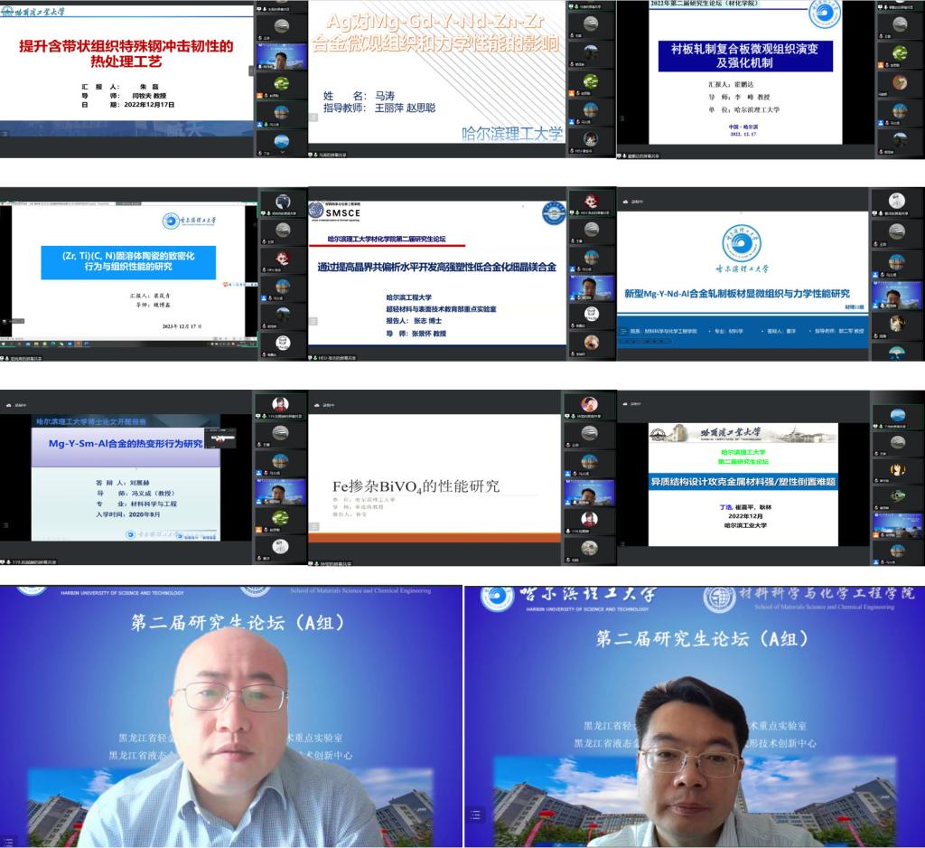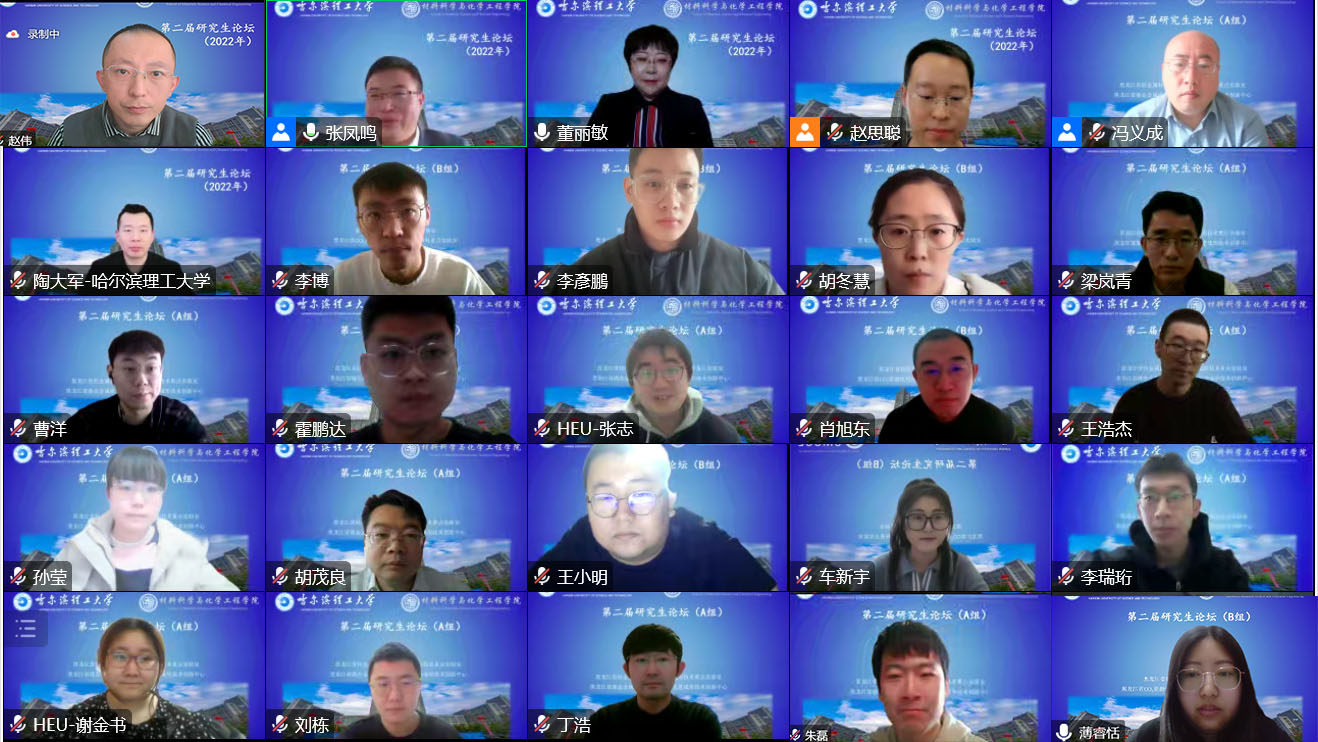 开幕式结束后,“金属与结构材料”和“有机/无机功能材料与化学”两个分会场同时开始了学术报告交流,由冯义成教授、胡茂良教授、庞海军教授和王永亮教授分组分段主持。经过前期充分准备,论坛学术委员会遴选了学院23个博士和硕士的优秀报告,同时邀请了哈尔滨工业大学、哈尔滨工程大学、黑龙江大学相近学科的10名优秀博士、硕士研究生为论坛做交流报告。本次论坛的主题是“务实创新 立足基础 跟踪前沿”,旨在贯彻习近平总书记关于研究生教育工作的重要指示精神和党的教育方针,落实立德树人根本任务,提升研究生教育质量,增强研究生学术氛围,促进研究生群体间的学术交流。来自我校材化学院、哈尔滨工业大学、哈尔滨工程大学和黑龙江大学共计400余名师生参加了论坛交流,线上会场气氛热烈,学术氛围浓郁,研究生们踊跃交流,点评专家点拨恰如其分。
