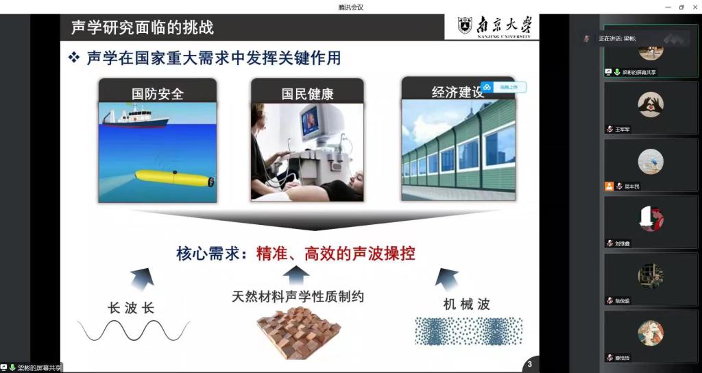 梁彬教授的报告题目为《当人工智能遇见人工结构:声超材料与人工智能的融合及其应用》。报告首先对声学超构材料进行了介绍,声学超构材料提供了天然材料不具备的特殊声学性能,可用于实现非对称声传播、高质量声全息、声涡旋操控等新奇声学现象,为突破传统局限提供了新的启示。接下来,梁彬教授介绍了通过融合人工智能与声人工结构产生的若干研究成果,针对声超材料仅以特定方式调控波场这一基本问题,以声人工结构构建了“类脑”系统,证明了基于深度学习设计的特殊序构能够使声超构单元集合具备完成特殊任务的“智能”。在报告中,梁彬教授通过通俗易懂的语言对研究成果进行了讲解,展示声学超构神经网络简便、实时、无源地完成复杂任务的新颖功能。此次报告激发了参会师生对声学与人工智能的研究热情和兴趣,对物理学科声学方向的研究工作大有裨益。