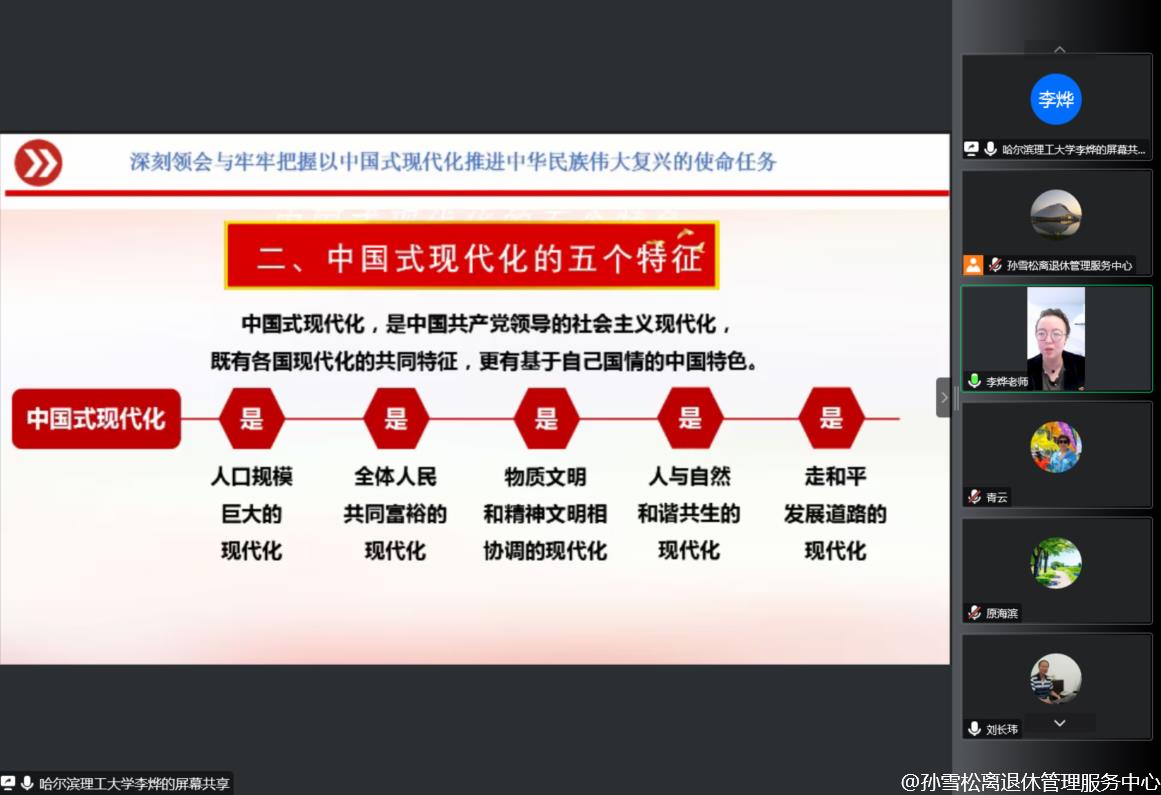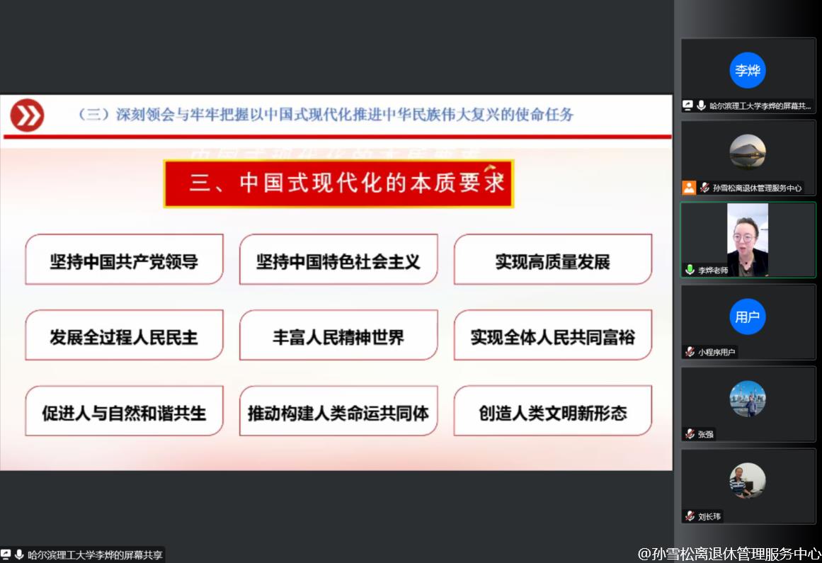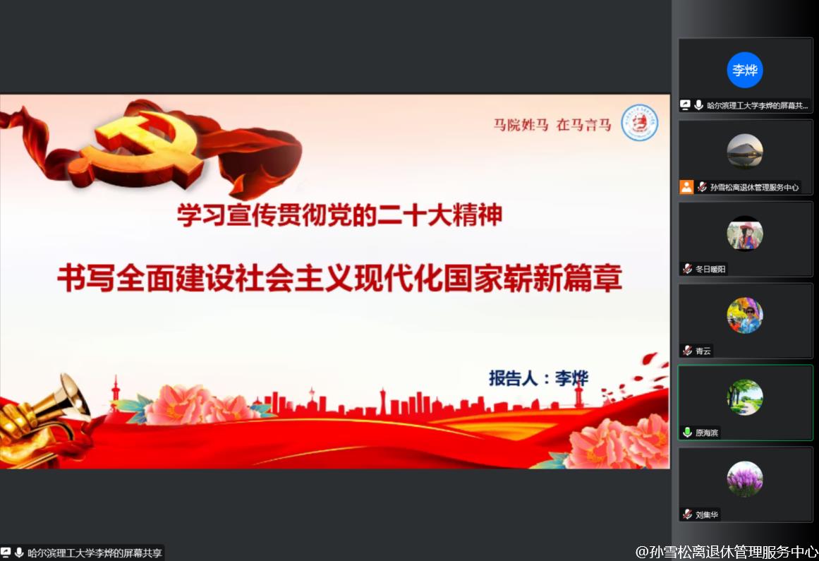 党的二十大是一次高举旗帜,凝聚力量,团结奋进的大会,取得了丰硕的政治成果、实践成果、理论成果、战略成果、制度成果,在党和国家事业发展进程中具有极其重大的历史意义。学深悟透党的二十大精神的精髓要义,对于我们党员同志来说尤为重要。为进一步深入学习党的二十大精神,12月19日上午,离退休党委邀请党的二十大精神学校宣讲团成员、马克思主义学院马克思主义基本原理教研室教师李烨通过视频方式为全体工作人员、离退休各党部书记、“五老”宣讲团成员和党员代表作党的二十大精神专题宣讲。