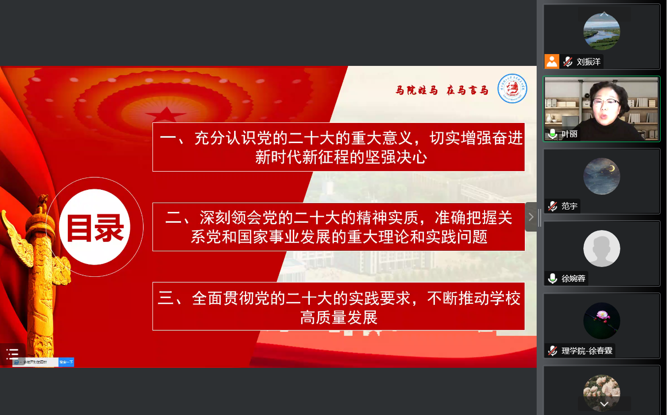 按照学校《关于在全校范围内开展党的二十大精神宣讲工作的通知》要求,12月21日,理学院邀请校宣讲团成员、马克思主义学院叶丽老师通过线上为学院135名师生党员作党的二十大精神专题宣讲,宣讲会由学院党委书记徐春霖主持。