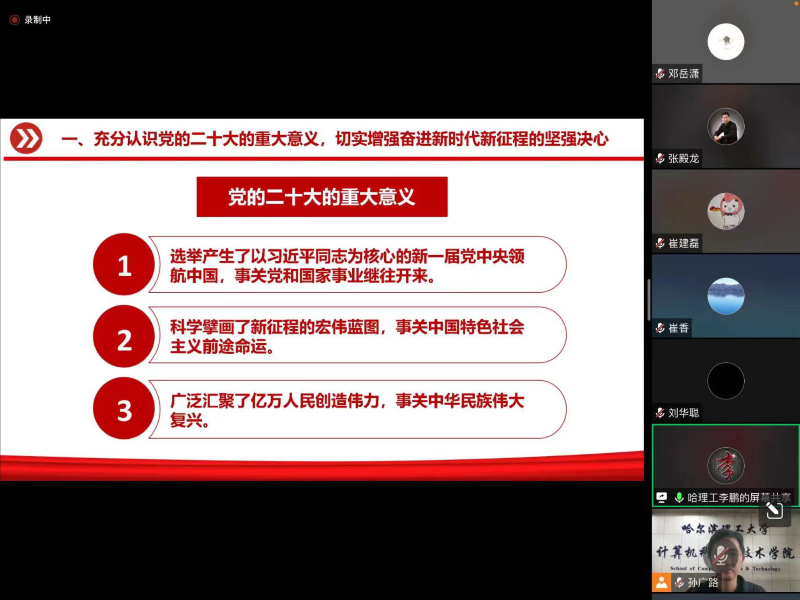 为深入学习贯彻党的二十大精神,认真落实省委、省委教育工委及学校党委相关工作部署,细化执行《中共哈尔滨理工大学委员会关于做好党的二十大精神宣讲工作的实施方案》《关于在全校范围内开展党的二十大精神宣讲工作的通知》的相关要求。近期,计算机科学与技术学院党委中心组以及各党支部以多种形式组织开展了党的二十大学习。