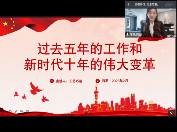 感悟思想伟力,把握精神实质。为进一步学习宣传贯彻党的二十大精神,深入推进习近平新时代中国特色社会主义思想落地生根,引领马克思主义学院学生踔厉奋发,勇毅前行。马克思主义学院团委于2023年2月22日组织开展党的二十大精神线上宣讲活动。本次活动邀请我院学生党的二十大精神宣讲团成员,学院硕士研究生王思巧漩同学作《过去五年工作和新时代十年伟大变革》为主题的宣讲。马克思主义学院本科生辅导员孙启瑞老师及全体学生参加此次宣讲会。