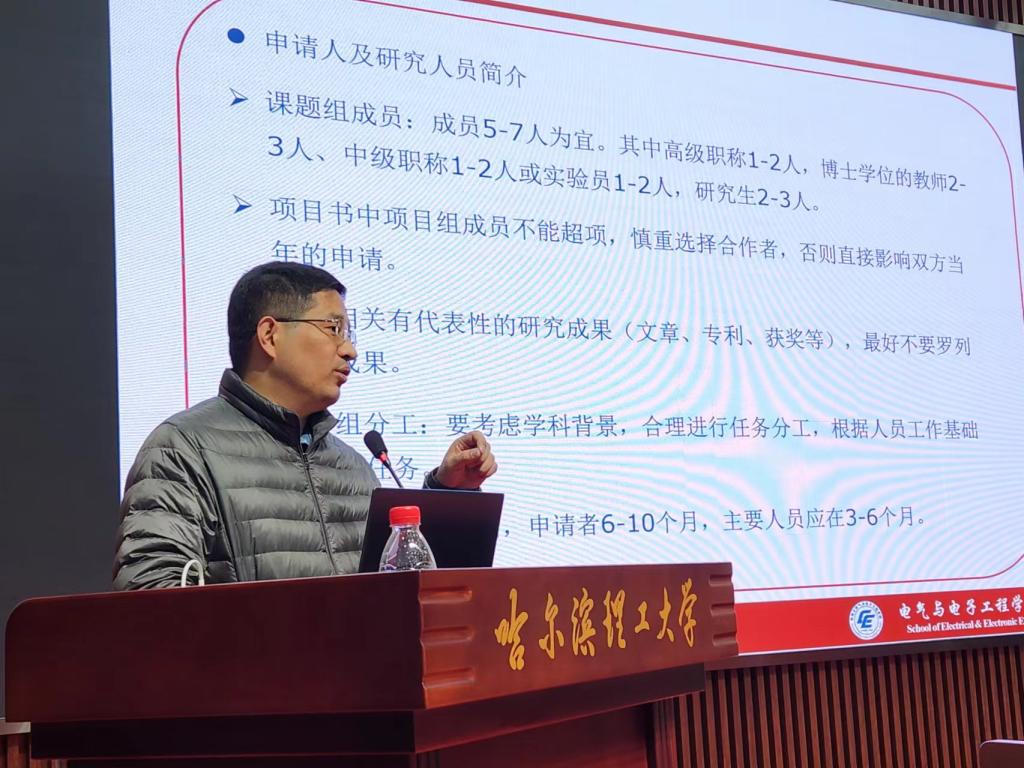 2月24日上午,科技处特邀请江南大学孙付保教授、我校电气与电子工程学院迟庆国教授作2023年国家自然科学基金申报指导讲座。讲座在教学主楼五楼报告厅举行,由科技处处长康守强主持,参加人包括各学院科研副院长、拟申报国家基金申请人以及具有博士学位的青年教师等百余名教师。