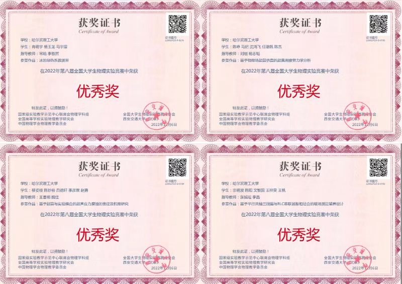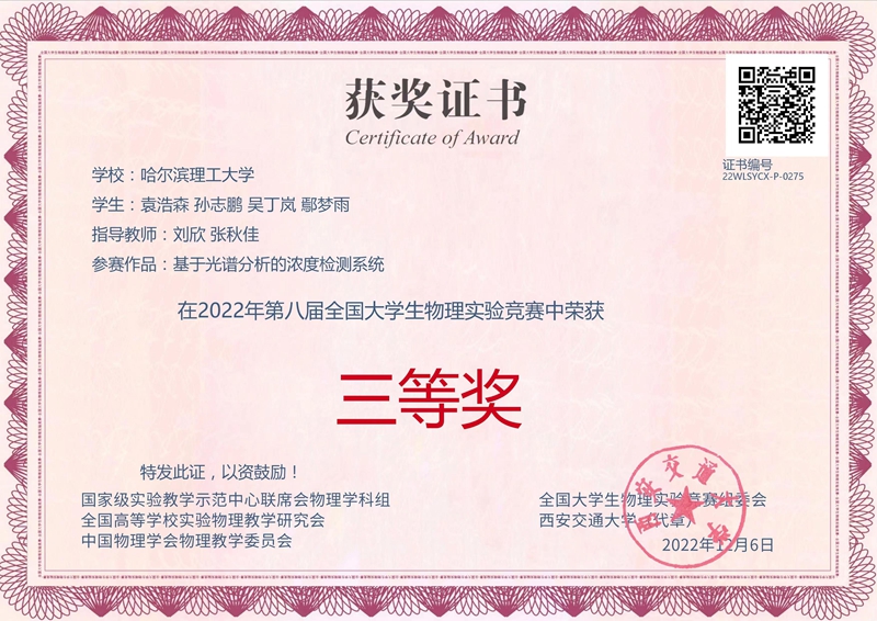 学校从40余支校内参赛队伍中经过评审选拔最终评选出5支队伍代表我校参加全国竞赛并获得优异成绩。在“命题类创新作品”中,由理学院刘欣、张秋佳老师指导,袁浩森、孙志鹏、吴丁岚、鄢梦雨同学设计的“基于光谱分析的浓度检测系统”获得国家三等奖;在“自选课题类创新作品”中,由理学院张铖瑶、李晶老师指导,宗明波、陈阳、文智国、王梓昊、王帆同学设计的“基于平行共轴三线圈与RLC串联谐振相结合的磁场测定装置”;由理学院常皓、李敬然老师指导,肖明宇、马宇濛、杨玉龙同学设计的“冰的导热系数测量”;由理学院杨志韬、刘刚老师指导,陈峥、陈杰、马纪、任璐帆、沈鸿飞同学设计的“基于物理场超算仿真的超高周疲劳力学分析”;由理学院魏佳、王喜明老师指导,柳姿岐、陈妙榕、吕德轩、季彦霖、赵勇同学设计的“基于超算与实验耦合的超声应力腐蚀的表征及机理研究”4项参赛作品获得优秀奖。