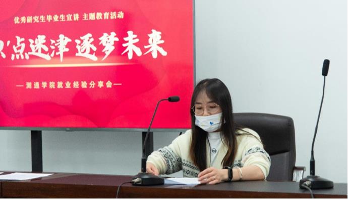测通学院党委副书记张宏磊线上参加了本次活动。他首先分析了当前的就业形势,介绍了研究生的就业情况以及校院精准就业服务的相关举措。他嘱托毕业生要发挥学院优秀毕业生朋辈引领示范作用,将宝贵的求学和求职经验分享给学弟学妹。希望在即将奔赴新征程的测通学子们要将理工“知行统一,博厚悠远”的校训融入日后的一言一行,在工作岗位上争做有理想、敢担当、能吃苦、肯奋斗的新时代好青年。建议在校生要提前做好规划,积极主动学习新思想、新知识、新技能,树立信心,增长才干,练就过硬本领,为高质量就业奠定坚实的基础。