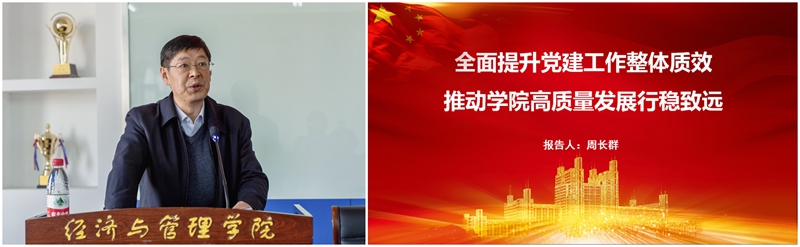 周长群在总结讲话时指出,深入贯彻落实学校“深入开展“工作落实年”活动暨全面推进学科建设干部大会”精神,树立鲜明的学科建设导向,凝聚全院教师的智慧与合力,完成好经管学院的“时代答卷”,意义重大,重任在肩。他强调,学院的新发展理念应体现在以学科建设为引领,以高质量为追求,以科学研究驱动创新型人才培养,构建经管学院可持续高质量发展体制机制,凝聚师生推动学院高质量发展的工作合力,以效率变革、动力变革促进学院发展的质量变革,实现学院高质量内涵式发展。围绕新理念,党建工作要提升思想引领力、班子战斗力、制度约束力、基层向心力和文化感召力,全面提升党建工作整体质效,推动学院高质量发展行稳致远。