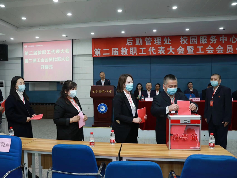 后勤领导董少伟、李昊、李晓东、伊立忠、刘畅等大会主席团成员在主席台就坐。29名教代会代表、27名工代会代表出席会议。学校工会办公室主任尹淼受邀出席大会。