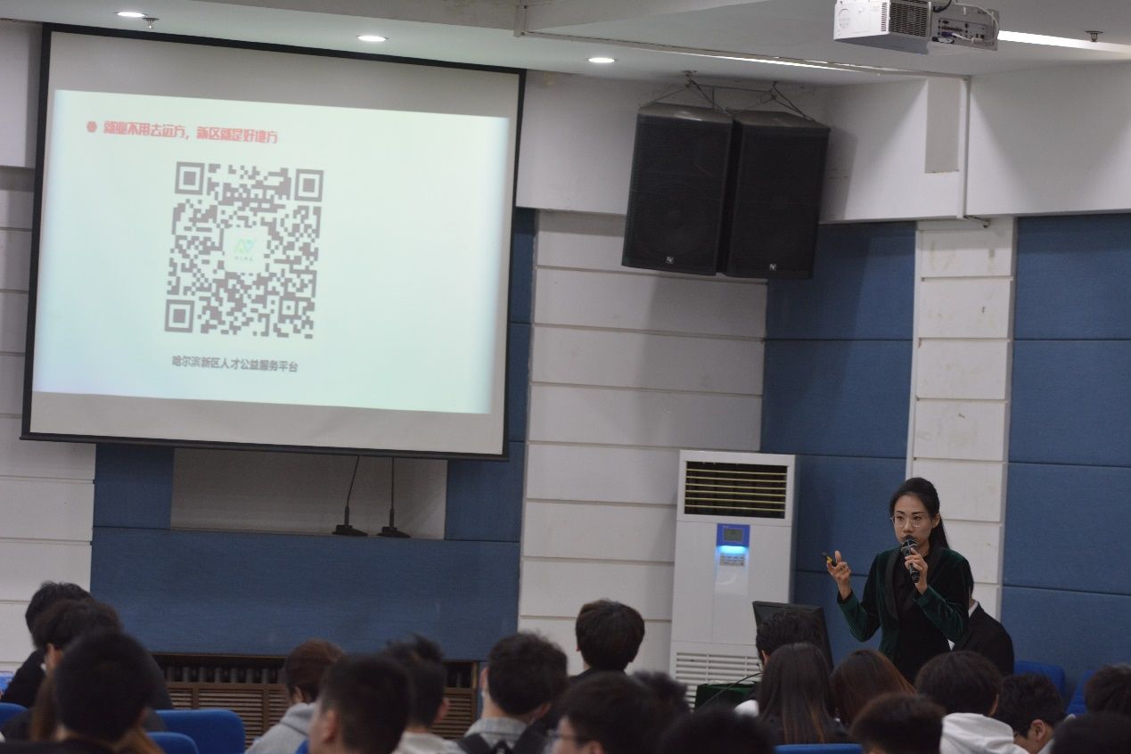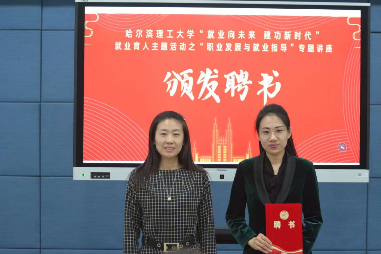 滕主任从自己丰富的从业经验及对就业形势分析数据引出今天讲座的内容,对当前就业形势和就业政策进行了详细分析,为学生对就业方向的疑惑进行细心解答。在与学生的不断互动之间,引导学生对未来职业做出规划,深入剖析如何在现有形式政策下更好择业就业。讲座过程中滕俊媛主任通过列数字,摆证据,更有说服力的讲解了各大企业在各大高校中寻求适配人才的规则。在介绍哈尔滨市人才新政30条的同时,滕主任运用趣味互动的方式,为讲座中增添了许多的活力。她希望这次讲座后学生们能学会理解国家与地方人才政策。最后,由大学生就业服务中心生涯规划与就业指导教研室主任王珊老师为滕俊媛主任颁发特约嘉宾聘书。