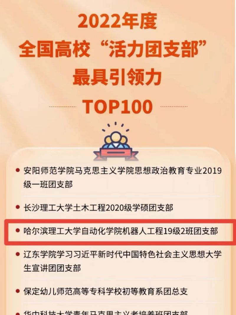 近日,由共青团中央基层建设部指导、中国青年报社主办的2022年度全国高校“活力团支部”最具引领力TOP100榜单揭晓,我校自动化学院机器人工程2019级2班团支部上榜,这是自动化学院团支部第三次获得此项殊荣。